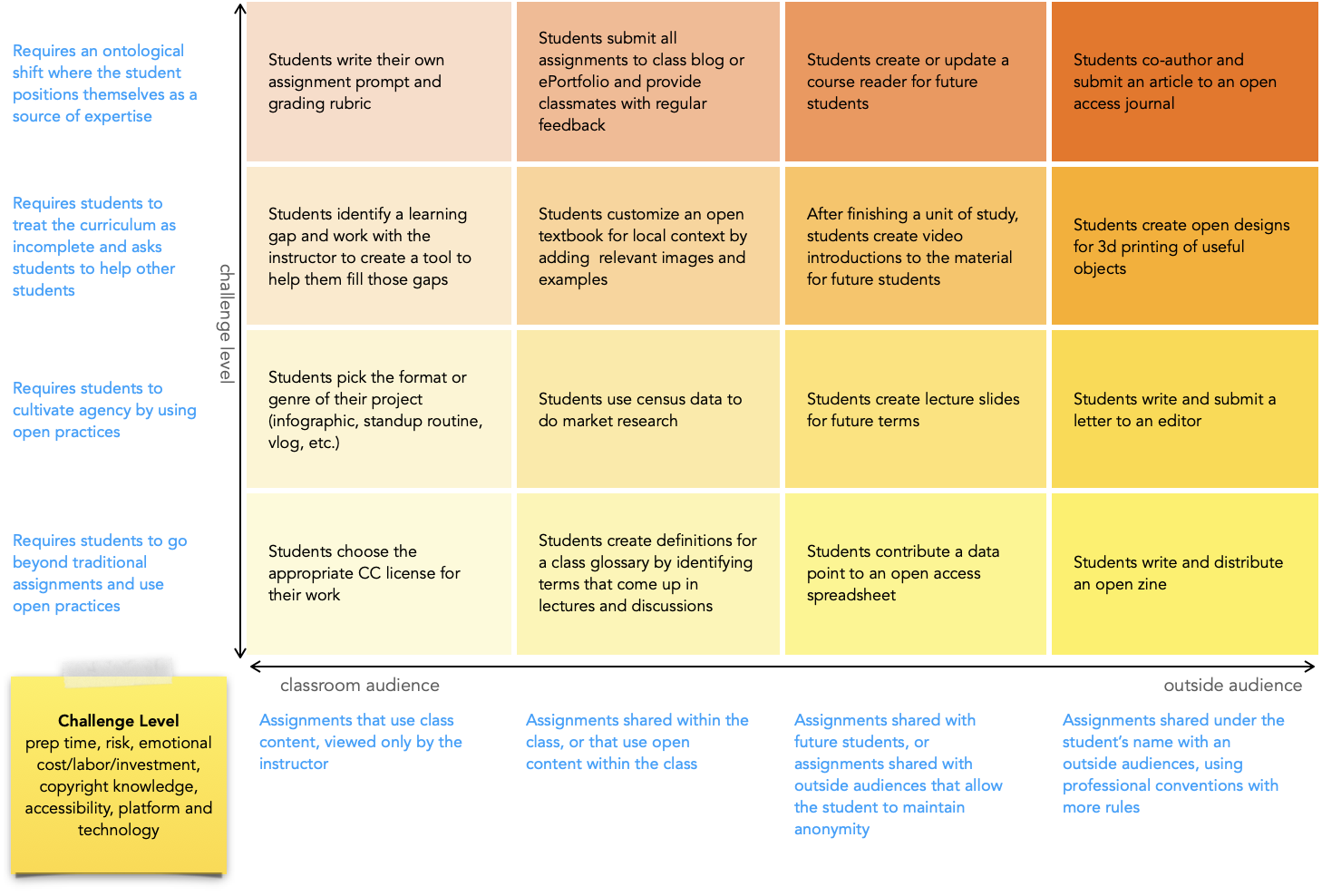 Open Educational Practices evoke complex feelings. Alongside excitement and newfound relevance in their coursework, “students might experience emotional pain, feelings of inadequacy, and vulnerability” (Pearce et al). As you consider open pedagogy opportunities, consider the degree of challenge you want to accept according to your own workload and teaching experiences.