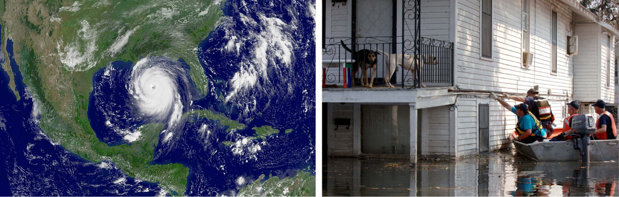 Figure 10.29. “Hurricane Katrina as it Approached New Orleans” was made available by the U.S. NOAA and published on Wikipedia (left). “FEMA Urban Search and Rescue Task Force Members” is made available by mad mags and published on Flickr, under CC BY-NC 2.0 (right).